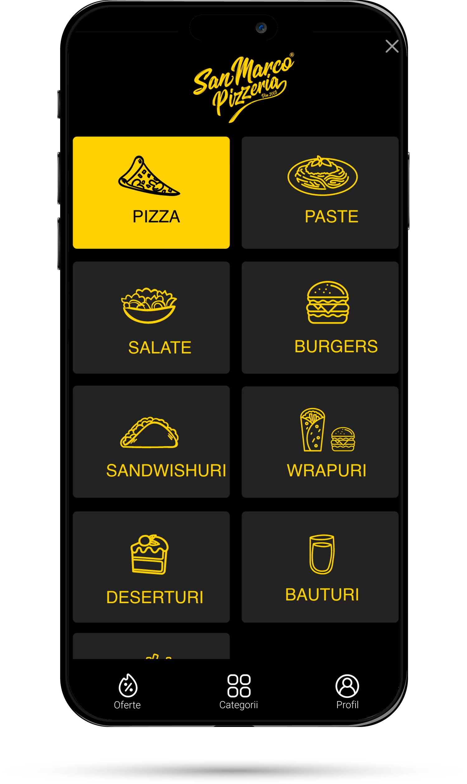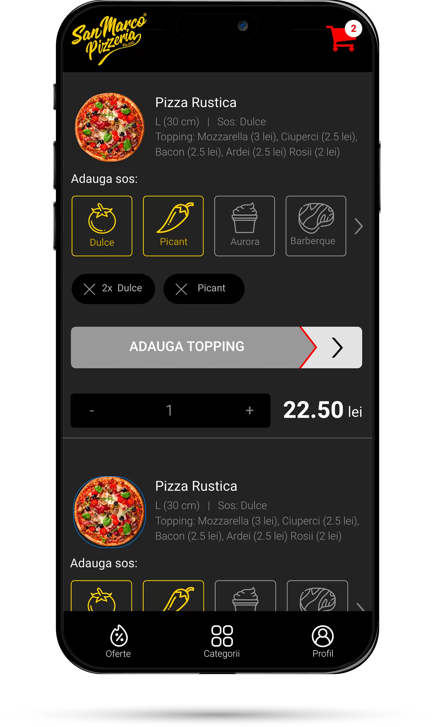 Aplicația de delivery cu un modul complex de configurare a produselor. Aplicația se conectează la softul intern de gestiune și preia datele referitoare la produse și trimite mai departe comenzile către dispecerat. Aplicația a fost realizată în React Native cu un backend în Laravel, în care se gestionează anumite setări. Mai departe, aplicația se conectează la softul restaurantelor și preia datele necesare.