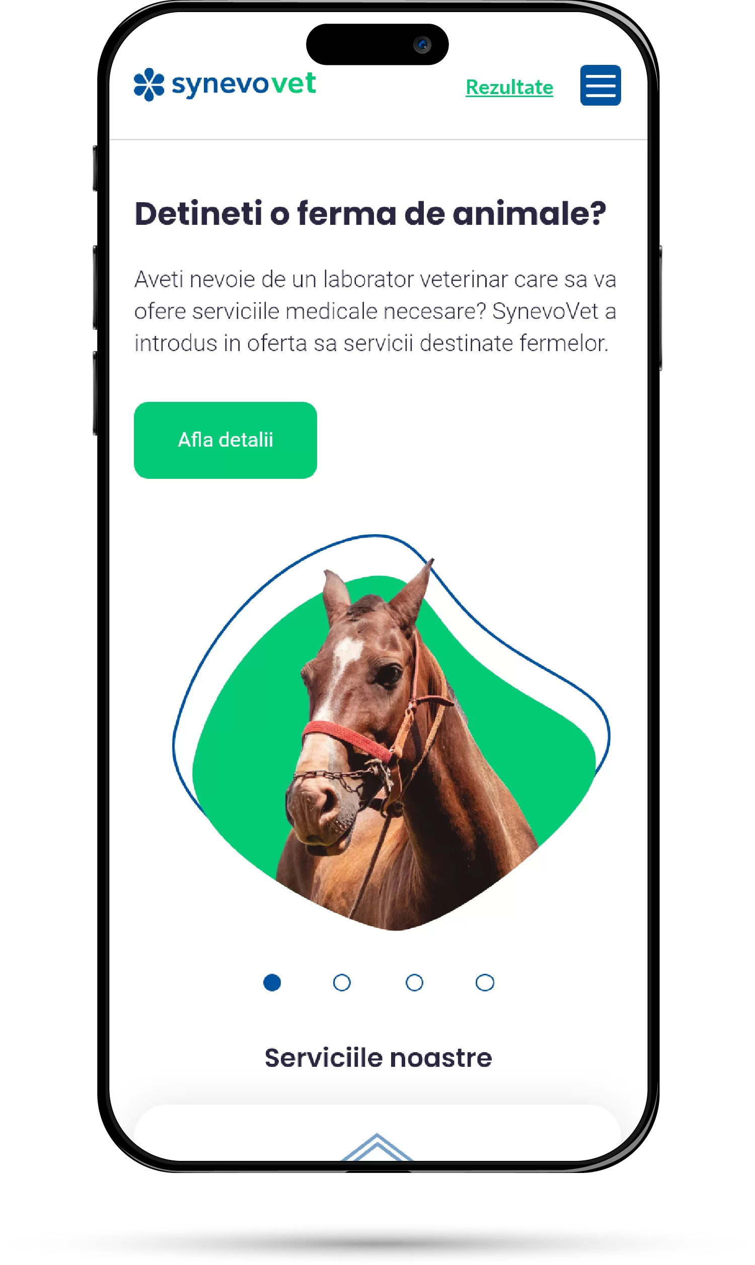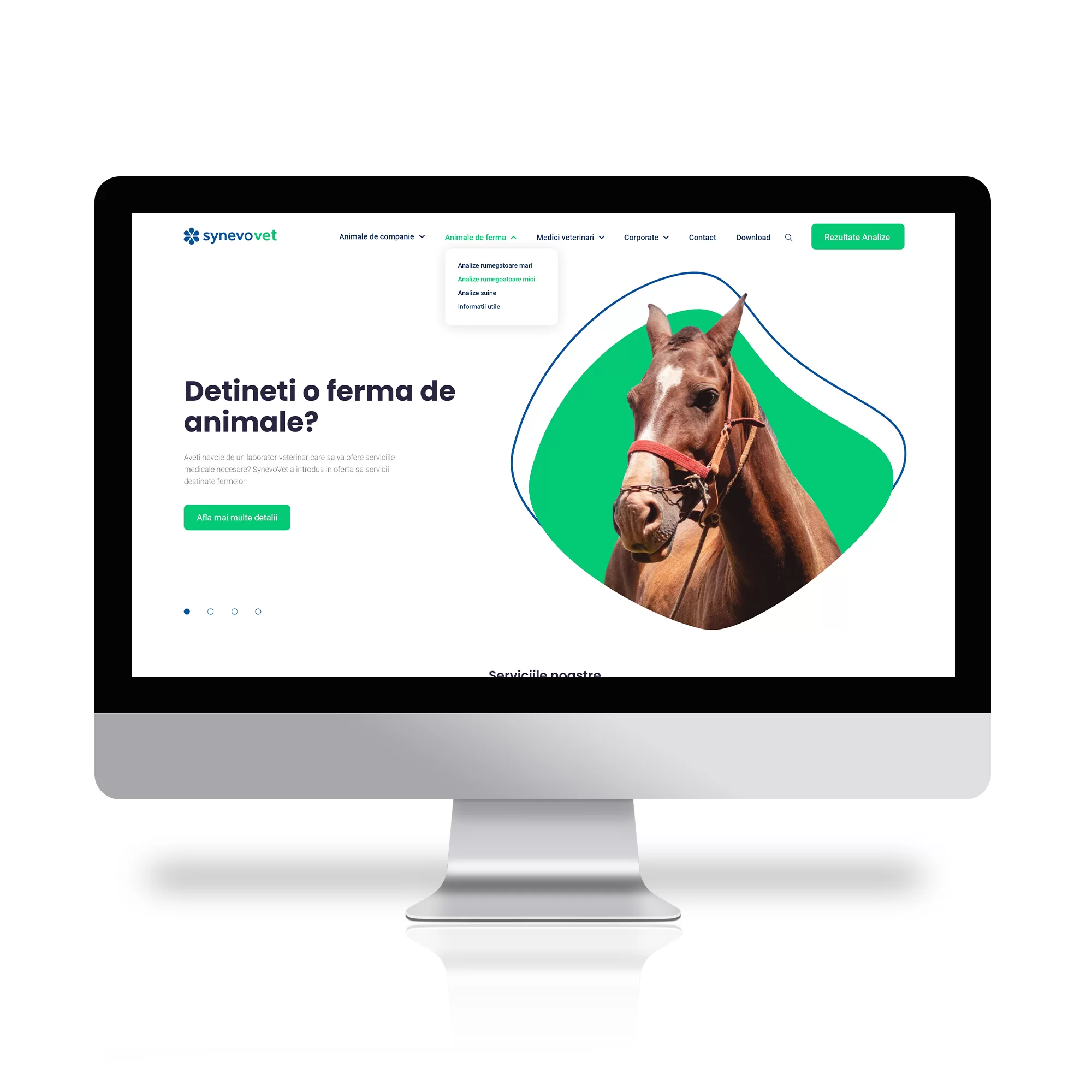 Divizia de laborator Synevo pentru ferme și animale de companie. Un website de prezentare de brand, cu o secțiune de produse, cu o structură dedicată specialiștilor. Website-ul este prezentat pentru B2B, dar cuprinde și secțiuni de informații B2C cu articole.